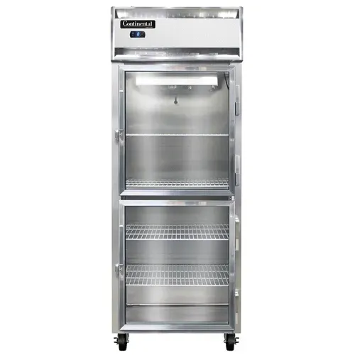 Discover kitchen perfection with the Continental Refrigerator 1FESNGDHD Freezer, Reach-In. This extra-wide, one-section freezer is designed to meet the demands of a commercial restaurant. With its shallow depth and wide half-height glass doors, it provides easy access to your frozen goods while maximizing space efficiency. The stainless steel front and aluminum exterior and interior ensure durability and easy cleaning, making it ideal for a busy kitchen environment. The electronic control with a digital display allows for precise temperature management, while the hi-low alarm alerts you to any fluctuations. With a powerful 1/2 HP self-contained refrigeration system, this freezer delivers reliable performance. Made in the USA and certified by cETLus and NSF, you can trust the quality and safety of this Continental Refrigerator. Upgrade your kitchen with the 1FESNGDHD Freezer, Reach-In and experience the perfect blend of functionality and style.