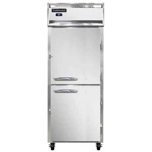 Ignite culinary passion with the Continental Refrigerator 1RENHD Reach-In Refrigerator. This extra-wide, one-section refrigerator is designed to meet the demands of a busy commercial restaurant. With its stainless steel front and aluminum interior and ends, this refrigerator is not only durable but also easy to clean, ensuring a hygienic food storage environment. The standard depth and half-height solid doors provide convenient access to your ingredients while maintaining energy efficiency. The electronic control with a digital display allows for precise temperature management, while the hi-low alarm alerts you if the temperature deviates from the set range. The electric condensate evaporator eliminates the need for manual defrosting, saving you time and effort. With a 1/4 HP compressor, this refrigerator provides reliable cooling performance. Made in the USA and certified by cETLus and NSF, the Continental Refrigerator 1RENHD is a trustworthy choice for any commercial kitchen.