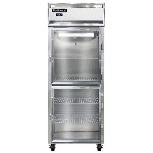 Introducing the Continental Refrigerator, 1RENSSGDHD, Refrigerator, Reach-In. Craft culinary wonders with this extraordinary refrigerator designed for commercial restaurant use. With its extra-wide, one-section design and stainless steel exterior and interior, this reach-in refrigerator is built to withstand the demands of a busy kitchen. The wide half-height glass doors not only provide easy access to your ingredients but also add a touch of elegance to your establishment. The electronic control with a digital display allows for precise temperature management, while the hi-low alarm ensures that your perishable items are always stored at the optimal temperature. Made in the USA and certified by cETLus and NSF, this refrigerator guarantees quality and safety. With its electric condensate evaporator and 1/3 HP compressor, this unit is both efficient and reliable. Upgrade your kitchen with the Continental Refrigerator, 1RENSSGDHD, and experience the difference in performance and durability.