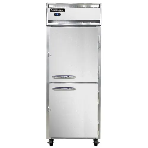 Empower your kitchen staff with the Continental Refrigerator, 1RESNSAHD, Reach-In Refrigerator. This extra-wide, one-section refrigerator is designed to meet the demands of a busy commercial restaurant. With its shallow depth and half-height solid doors, it provides easy access to your ingredients while maximizing space efficiency. The stainless steel exterior and aluminum interior ensure durability and easy cleaning, while the self-contained refrigeration system keeps your food at the perfect temperature. The electronic control with a digital display allows for precise temperature management, and the hi-low alarm alerts your staff if the temperature goes outside the desired range. With a 1/4 HP motor, this refrigerator is powerful enough to handle the needs of a bustling kitchen. Made in the USA and certified by cETLus and NSF, you can trust the quality and reliability of this Continental Refrigerator. Upgrade your kitchen with this top-of-the-line reach-in refrigerator.