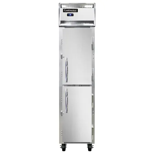 Elevate your culinary experience with the Continental Refrigerator 1RSENSSHD Reach-In Refrigerator. This slim line, one-section refrigerator is designed to meet the needs of commercial restaurants. With its stainless steel interior and exterior, it not only looks sleek but also ensures durability and easy cleaning. The half-height solid doors provide easy access to the contents while maintaining temperature control. The electronic control with a digital display allows for precise temperature adjustments, while the hi-low alarm alerts you if the temperature goes outside the desired range. The electric condensate evaporator eliminates the need for manual defrosting, saving you time and effort. Made in the USA, this refrigerator is cETLus and NSF certified, guaranteeing its quality and safety. Whether you're storing ingredients or keeping prepared dishes fresh, the Continental Refrigerator 1RSENSSHD Reach-In Refrigerator is the perfect addition to any commercial kitchen.