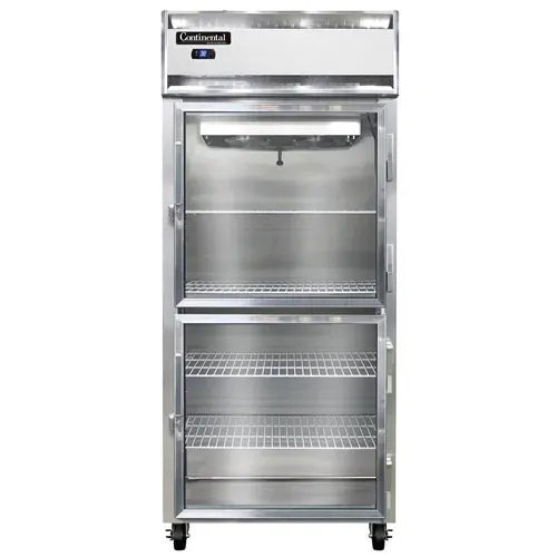 Master the art of flavor with the Continental Refrigerator, 1RXSNGDHD Reach-In Refrigerator. This extra-wide, one-section refrigerator is designed to meet the needs of commercial restaurants. With a shallow depth and an aluminum exterior and interior, this refrigerator is both durable and easy to clean. The stainless steel front adds a sleek and professional look to any kitchen. The extra wide half-height glass doors allow for easy visibility and access to your ingredients, while the electronic control with digital display ensures precise temperature control. The hi-low alarm alerts you if the temperature goes outside the desired range, helping to maintain the freshness and quality of your food. With a 1/3 HP compressor, this refrigerator is powerful enough to handle the demands of a busy kitchen. Made in the USA and certified by cETLus and NSF, you can trust the Continental Refrigerator, 1RXSNGDHD to deliver exceptional performance and reliability. Upgrade your restaurant's refrigeration capabilities with this top-of-the-line reach-in refrigerator.