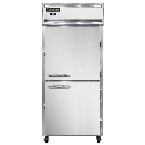 Unleash your kitchen's potential with the Continental Refrigerator, 1RXSNHD, Refrigerator, Reach-In. This extra-wide, one-section refrigerator is designed to meet the demands of a busy commercial restaurant. With a shallow depth and half-height solid doors, it maximizes space while providing easy access to your ingredients. The stainless steel front and aluminum interior and ends ensure durability and easy cleaning, while the self-contained refrigeration system keeps your food at the perfect temperature. The electronic control with a digital display allows for precise temperature management, and the hi-low alarm alerts you if the temperature deviates from the set range. With a 1/4 HP motor, this refrigerator is powerful enough to handle the needs of a bustling kitchen. Made in the USA and certified by cETLus and NSF, you can trust the quality and reliability of this Continental Refrigerator. Upgrade your kitchen with this top-of-the-line reach-in refrigerator.