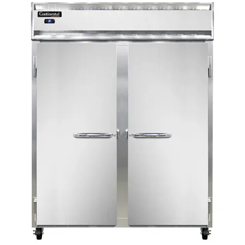 Fuel your restaurant's success with the Continental Refrigerator, 2RESN, Refrigerator, Reach-In. This extra-wide, two-section refrigerator is designed to meet the demands of a busy commercial kitchen. With its self-contained refrigeration system, stainless steel front, and aluminum interior and ends, this refrigerator is built to withstand the rigors of a restaurant environment. The shallow depth and full-height solid doors make it easy to access and organize your ingredients, while the electronic control with digital display allows for precise temperature management. The hi-low alarm ensures that you are alerted if the temperature goes outside the desired range, helping to protect your valuable inventory. With a 1/3 HP compressor, this refrigerator provides reliable cooling power. Made in the USA and certified by cETLus and NSF, you can trust the quality and safety of this Continental Refrigerator. Upgrade your kitchen with the 2RESN and experience the convenience and efficiency it brings to your restaurant operations.