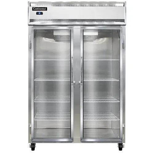 Transform your food service with the Continental Refrigerator, 2RNSGD, Refrigerator, Reach-In. This two-section reach-in display refrigerator is designed to meet the needs of commercial restaurants. With its aluminum exterior and interior, along with a stainless steel front, this refrigerator is built to withstand the demands of a busy kitchen. The narrow sliding glass doors provide easy access to the contents while maintaining temperature control. The electronic control with a digital display allows for precise temperature adjustments, ensuring that your food stays fresh and safe. The hi-low alarm alerts you if the temperature goes outside the desired range, preventing spoilage. The electric condensate evaporator eliminates the need for manual defrosting, saving you time and effort. With a 1/2 HP compressor, this refrigerator provides efficient cooling power. Made in the USA and certified by cETLus and NSF, you can trust the quality and reliability of this Continental Refrigerator. Upgrade your restaurant's refrigeration system with the 2RNSGD and experience enhanced efficiency and performance.