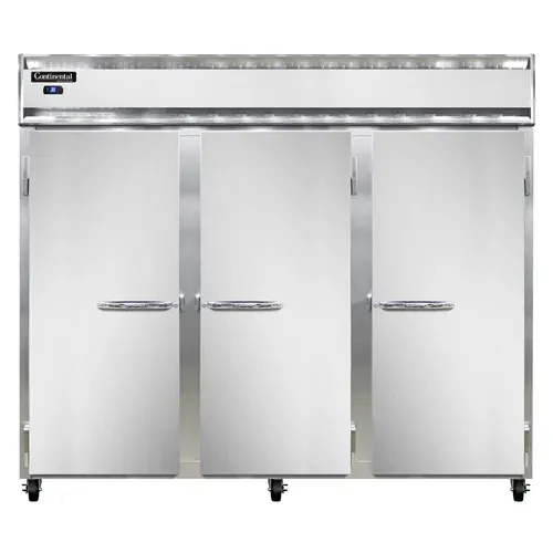 Cook with precision using the Continental Refrigerator 3REN Reach-In Refrigerator. This extra-wide, three-section refrigerator is designed for commercial restaurant use, providing ample storage space for your ingredients. With its self-contained refrigeration system, stainless steel front, and aluminum interior and ends, this refrigerator is built to withstand the demands of a busy kitchen. The full-height solid doors ensure easy access to your items, while the electronic control with a digital display allows for precise temperature management. The hi-low alarm alerts you if the temperature goes outside the desired range, ensuring the freshness and safety of your food. Made in the USA and certified by cETLus and NSF, this refrigerator is a reliable and high-quality choice for any restaurant. Upgrade your kitchen with the Continental Refrigerator 3REN Reach-In Refrigerator and experience the convenience and efficiency it brings to your culinary operations.