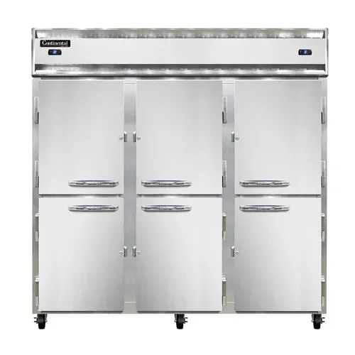 Create culinary magic with the Continental Refrigerator 3RRFNHD Refrigerator Freezer. This reach-in, three-section unit is perfect for commercial restaurant use. With its self-contained refrigeration system, stainless steel front, and aluminum interior and ends, this refrigerator freezer is built to withstand the demands of a busy kitchen. The standard depth and half-height solid doors provide easy access to your ingredients and allow for efficient organization. The electronic control with digital display ensures precise temperature control, while the hi-low alarm alerts you if the temperature deviates from the set range. The electric condensate evaporator eliminates the need for manual defrosting, saving you time and effort. With dual 1/3 and 1/3 HP compressors, this unit provides powerful and reliable cooling. Trust Continental Refrigerator to deliver the quality and performance you need to create culinary masterpieces in your restaurant.