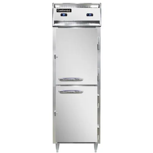 Achieve culinary excellence with the Continental Refrigerator D1RFSNHD* Refrigerator Freezer. This designer line reach-in unit is perfect for commercial restaurant use, offering both a refrigerator and freezer in one convenient package. With a total capacity of 16 cu. ft., this self-contained unit provides ample storage space for all your ingredients and frozen goods. The shallow depth cabinet and narrow half-height solid doors make it easy to access items, even in tight spaces. The aluminum exterior and interior ensure durability and easy cleaning, while the stainless steel front and doors add a touch of elegance. The electronic control with digital display allows for precise temperature management, and the hi-low alarm alerts you if the temperature deviates from the set range. With dual 1/5 & 1/4 HP compressors, this unit delivers powerful and efficient cooling. Made in the USA and certified by cETLus and NSF, the Continental Refrigerator D1RFSNHD* is a reliable and high-quality choice for any commercial kitchen.
