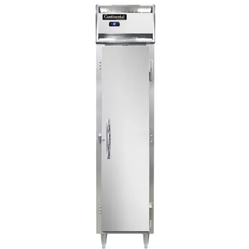 Enhance your commercial kitchen with the Continental Refrigerator D1RSEN* Reach-In Refrigerator. This designer slim line refrigerator is perfect for any restaurant looking to optimize their storage space. With its narrow full-height solid door and standard depth cabinet, this refrigerator is designed to fit seamlessly into any kitchen layout. The self-contained refrigeration system ensures that your food stays fresh and at the perfect temperature. The electronic control with digital display allows for easy monitoring and adjustment of the temperature, while the hi-low alarm alerts you if there are any fluctuations. Made in the USA with an aluminum exterior and interior, as well as a stainless steel front, this refrigerator is built to withstand the demands of a commercial kitchen. The 6" stainless steel legs provide stability and make cleaning underneath a breeze. Trust Continental Refrigerator for all your commercial refrigeration needs.