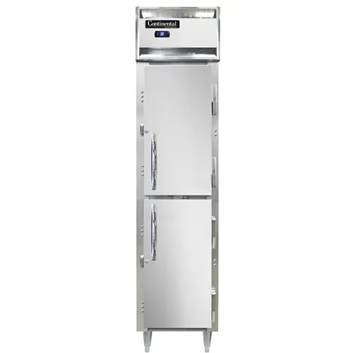 Cook with confidence and flair with the Continental Refrigerator D1RSESNSSHD Reach-In Refrigerator. This designer slim line refrigerator is perfect for commercial restaurant use, offering a narrow half-height solid door and a shallow depth cabinet. The stainless steel exterior and interior not only provide durability but also give a sleek and professional look to any kitchen. The electronic control with a digital display allows for easy temperature adjustment and monitoring, while the hi-low alarm ensures that your food stays at the optimal temperature. With a 1/4 HP compressor, this refrigerator provides reliable and efficient cooling. The 6" stainless steel legs offer stability and make it easy to clean underneath. Made in the USA and certified by cETLus and NSF, this Continental Refrigerator is a high-quality and trustworthy choice for any commercial kitchen.