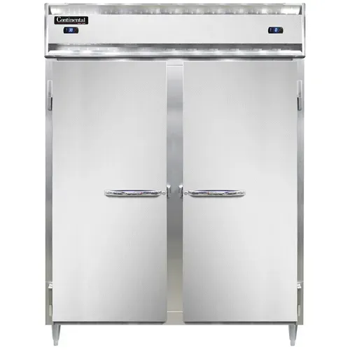 Cook with confidence with the Continental Refrigerator D2RFESNSS Refrigerator Freezer. This designer line reach-in unit is perfect for commercial restaurant use. With a spacious 57"W and a total capacity of 22 cu. ft., this refrigerator freezer provides ample storage space for all your ingredients. The shallow depth cabinet and wide full-height solid doors make it easy to access and organize your items. The stainless steel exterior and interior not only give it a sleek and professional look but also ensure durability and easy cleaning. The electronic control with a digital display allows for precise temperature management, while the hi-low alarm alerts you if the temperature goes outside the desired range. Equipped with dual 1/4 & 1/3 HP compressors, this self-contained refrigeration unit offers efficient cooling and reliability. Made in the USA and certified by cETLus and NSF, the Continental Refrigerator D2RFESNSS is a top-quality choice for any commercial kitchen.