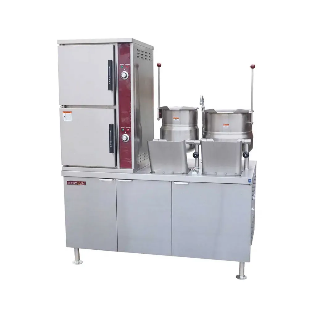 Introducing the Crown convection steamers, a powerful combination of functionality and advanced design, featuring two tilting kettles mounted on a robust modular electric steam boiler base. Crafted from premium type 304 stainless steel with a sleek #4 finish, these steamers include a deck-mounted faucet valve, a convenient swing nozzle, and an integral sink with a common drain, ensuring efficiency and ease of use in any kitchen setting. Designed for optimal performance, the convection steamer doors boast removable inner liners crafted from high-quality stainless steel and include a full perimeter gasket seal. The outer shell is constructed from a single piece of all-welded stainless steel, providing durability and integrity. A positive lock and seal mechanism, along with a stainless steel drip trough that connects to the drain, effectively collects condensate whenever the doors are opened, maintaining a clean and safe working environment. Each cooking chamber is meticulously constructed from all-welded type 316 stainless steel, fully insulated and fitted with removable stainless steel pan supports, ensuring longevity and ease of cleaning. Steamer controls are strategically placed for convenience, accessible through a fully removable side panel. Each compartment features a 60-minute mechanical timer with both ready and cooking pilot lights. The innovative design interrupts steam flow to the chamber when the door is opened during the cooking cycle, automatically resuming steam flow upon closing. An audible signal clearly marks the end of the cooking cycle, adding to the unit's user-friendly functionality. The cabinet base, housing the electric boiler and controls, is engineered with a full perimeter painted angle frame and reinforced mounts for the kettle and boiler. Its hinged doors feature a magnetic latch for secure closure, and the six-inch (152 mm) stainless steel legs are accompanied by four adjustable flanged feet for steadfast support on the floor. The comprehensive boiler controls include automatic water level control, a pressure gauge, water gauge glass, operating pressure control, safety high-limit pressure control, and a safety relief valve, making this unit as safe as it is efficient. With a standard water treatment system, split water line, CSD-1 boiler controls, and automatic blowdown, this unit provides everything necessary for peak performance. The boiler is proudly ASME code stamped and registered with the National Board, ensuring the highest standards of safety and reliability are met. Invest in the Crown convection steamers for a seamless, powerful cooking experience that enhances your kitchen's productivity and quality.