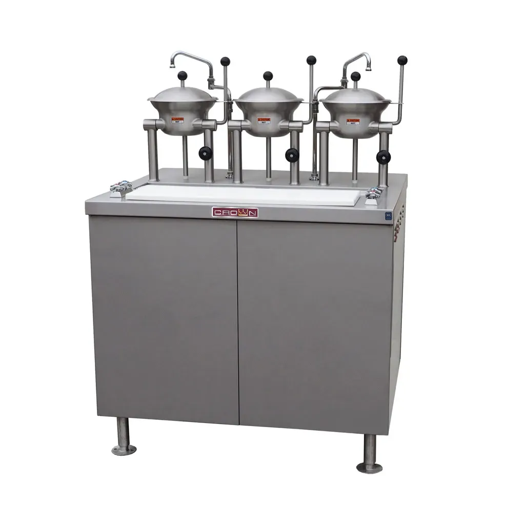 The Crown Oyster Cookers are constructed with type 316 stainless steel for both the inner and outer shells, featuring a #4 finish and one-piece welded construction. Each 2-quart cooker includes a tilt handle and heat-resistant knob, allowing for a full 90° tilt for complete emptying. The stainless steel mounting legs house the steam supply and condensate, with the right leg fitted with a steam control valve for precise operation. Each unit is equipped with a stainless steel lift-off cover. These cookers are mounted on a cabinet base with a full perimeter angle frame, reinforced counter, and a spillage sink complete with a drain and drain screen. The base also includes boiler mountings, an electric boiler with controls, hinged doors with magnetic catches, and removable side panels. The unit rests on 6” (152 mm) stainless steel legs with 4 adjustable flanged feet for securing it to the floor. The entire exterior is finished with #4 stainless steel. The steam manifold is concealed within the cabinet and features a steam trap and safety relief valve. Standard features include automatic boiler blowdown, CSD-1 boiler controls, and a split water line.