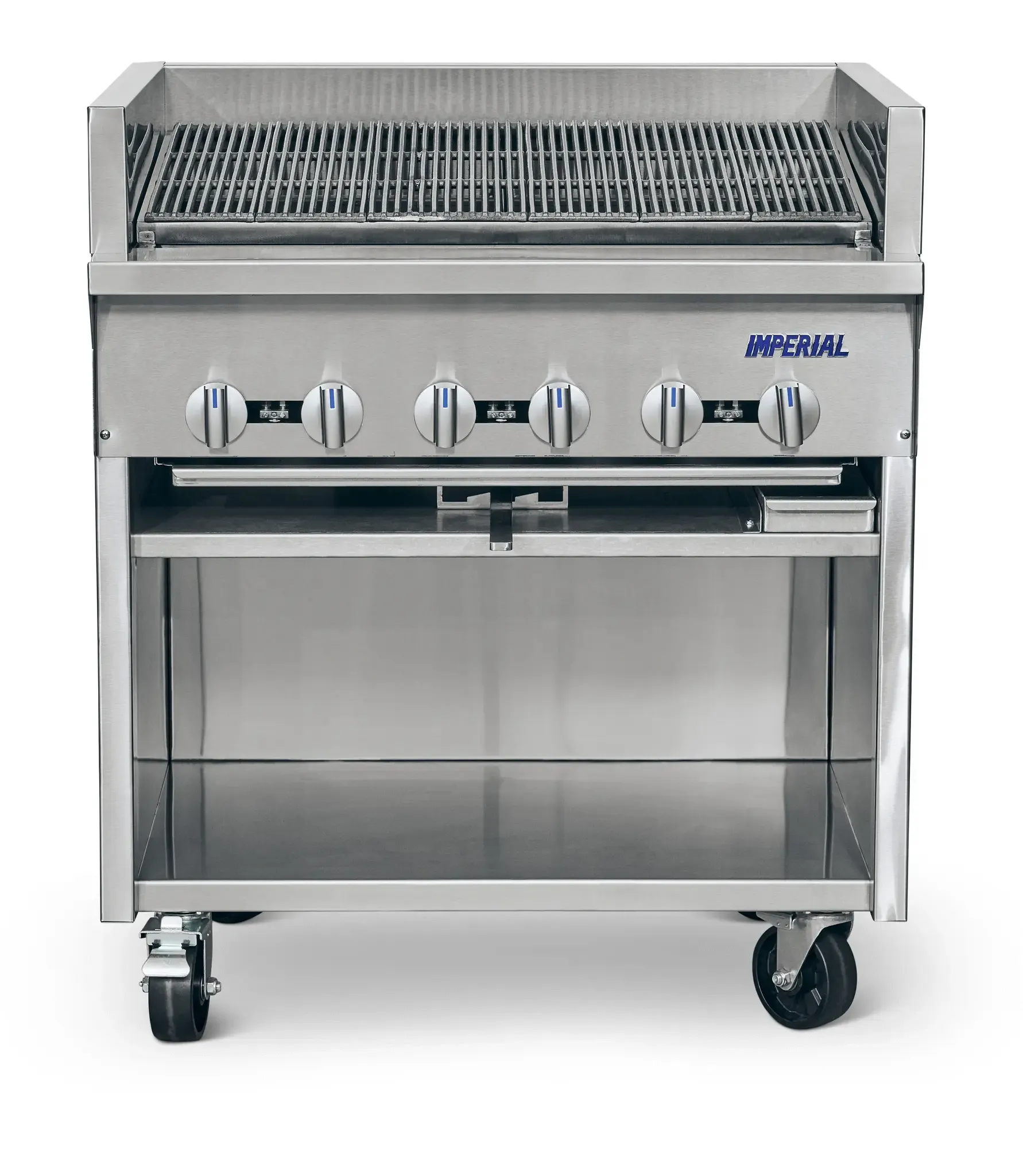 Unleash gastronomic brilliance with the Imperial IABF-36 Gas Floor Model Charbroiler. Designed for commercial restaurant use, this charbroiler is a game-changer in the kitchen. With six stainless steel burners, it delivers consistent and even heat distribution, ensuring perfectly cooked steaks every time. The slanted three-position cast iron top grate allows for versatile cooking options, while the open cabinet base provides convenient storage for utensils and supplies. The full-width grease gutter and removable grease can make cleaning a breeze, saving valuable time and effort. Made with durable stainless steel construction, this charbroiler is built to withstand the demands of a busy kitchen. With a powerful 120,000 BTU output, this charbroiler is a reliable workhorse that will elevate your restaurant's grilling game. Trust Imperial, a trusted name in commercial kitchen equipment, to deliver exceptional quality and performance.