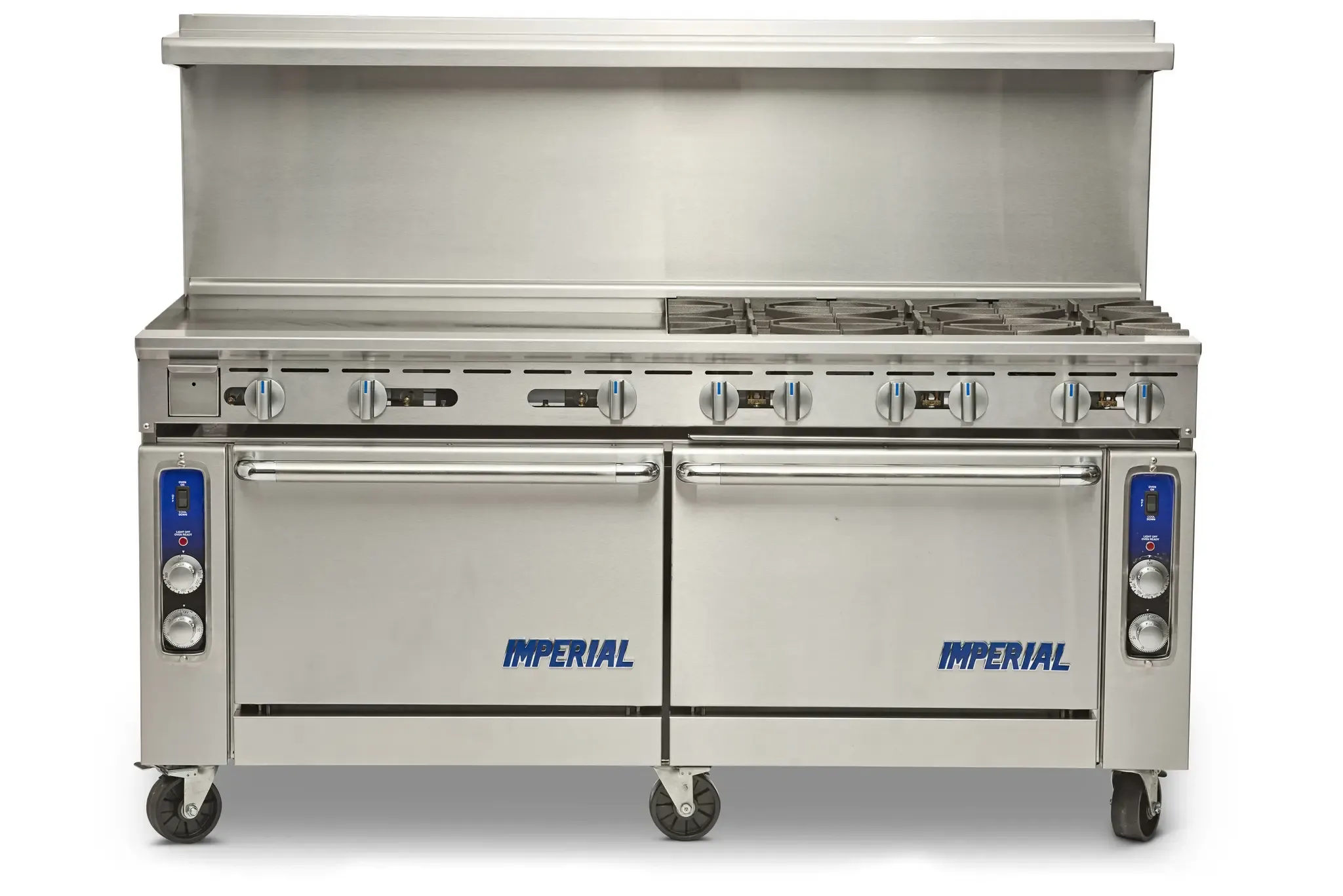 Introducing the Imperial IR-4-G48-CC Range, the perfect companion for commercial restaurant owners looking to master the art of cooking. This restaurant range is designed to meet the demands of a busy kitchen, with its impressive features and exceptional performance. The range boasts four open burners, allowing for versatile cooking options, while the 48" griddle provides ample space for preparing delicious dishes. With two convection ovens and three chrome racks per oven, you can easily bake, roast, and broil to perfection. The stainless steel construction ensures durability and easy cleaning, while the 3" grease trough, removable grease pan, and crumb tray make maintenance a breeze. Equipped with adjustable feet and 6" legs, this range offers flexibility and stability. With a powerful 268,000 BTU output, this NSF, CE, CSA Flame, and CSA Star certified range delivers exceptional performance and reliability. Upgrade your restaurant kitchen with the Imperial IR-4-G48-CC Range and elevate your culinary creations to new heights.