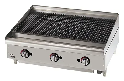 Star-Max radiant and lava rock charbroilers are designed to provide excellent heating and control when preparing a wide variety of products. The units are designed with durability and flexibility in mind with cast iron burners and a control knob for each twelve 12 inch section. The grates have been designed to hold a high capacity of product for maximum efficiency under demanding cooking situations.