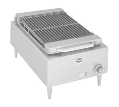 Wells B-44 Countertop 20" Wide Broiler has a stainless-steel top and sides that make this broiler one of the most durable in the industry. Self-cleaning elements are positioned between the broiler grate ribs to protect against direct food contact and spatula abrasion and are protected by the heavy-duty removable cast-iron grates and provide two heat zones for flexibility in broiling. Temperature is regulated by individual infinite controls, lift-out, drawn drip pans with handles, and each unit is provided with a grate scraper/brush and 4" adjustable metal legs.