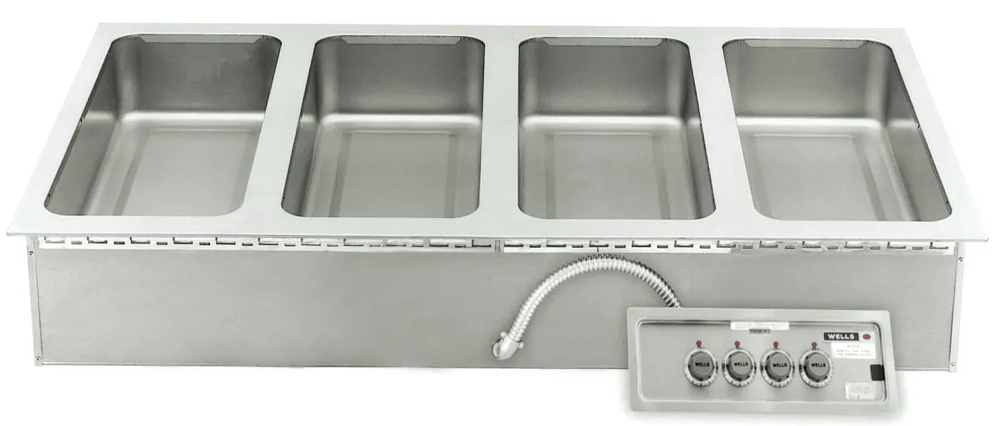 Wells MOD-427TDM heavy-duty, top-mount, drop-in, Modular food warmer is designed to hold heated foods at safe and fresh serving temperatures. Unit Accommodates Extra Deep 12" x 27", 4/3rd food pans and accommodates 4 each 1/3 size pans per well or equivalent fractional inset pans. Unit is designed for wet or dry operation. One-piece stainless steel top flange and heavy-gauge, deep-drawn stainless steel warming pans are standard features on all models. WellsLoks are standard for quick and easy installation. Sides, front, back, and bottom are fully insulated, Individual controls for each well, High-limits prevent overheating, and powerful tubular heating elements are located under the warming pans for quick, efficient, and even heating. Four pans, Thermostat control, Drain with Manifold, 208/240V