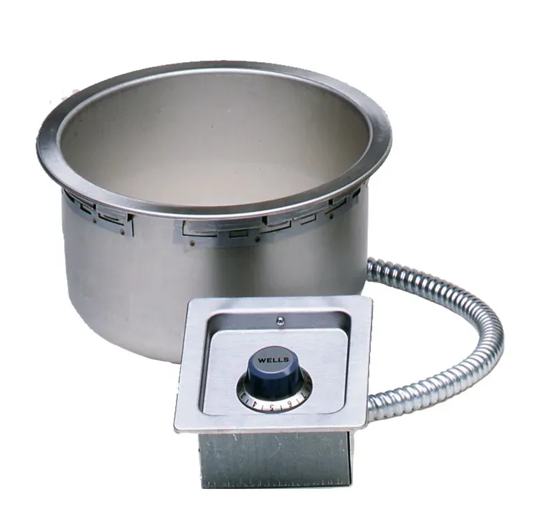 Wells SS-10TDUIAF heavy-duty, top-mount, drop-in round food warmer is designed to hold heated foods at safe and fresh serving temperatures. Accommodates standard 11 quart round inset pans, one-piece stainless steel top flange and heavy-gauge, deep-drawn stainless steel warming pans. Temperature-ready indicator lights and powerful tubular heating elements are located under the warming pans for quick and efficient heating and for even heat distribution. High limits prevent overheating, and Wellsloks for quick and easy installation are standard features. Thermostatic Control, Drain, Insulated, UL Approved, Auto Fill, 120V
